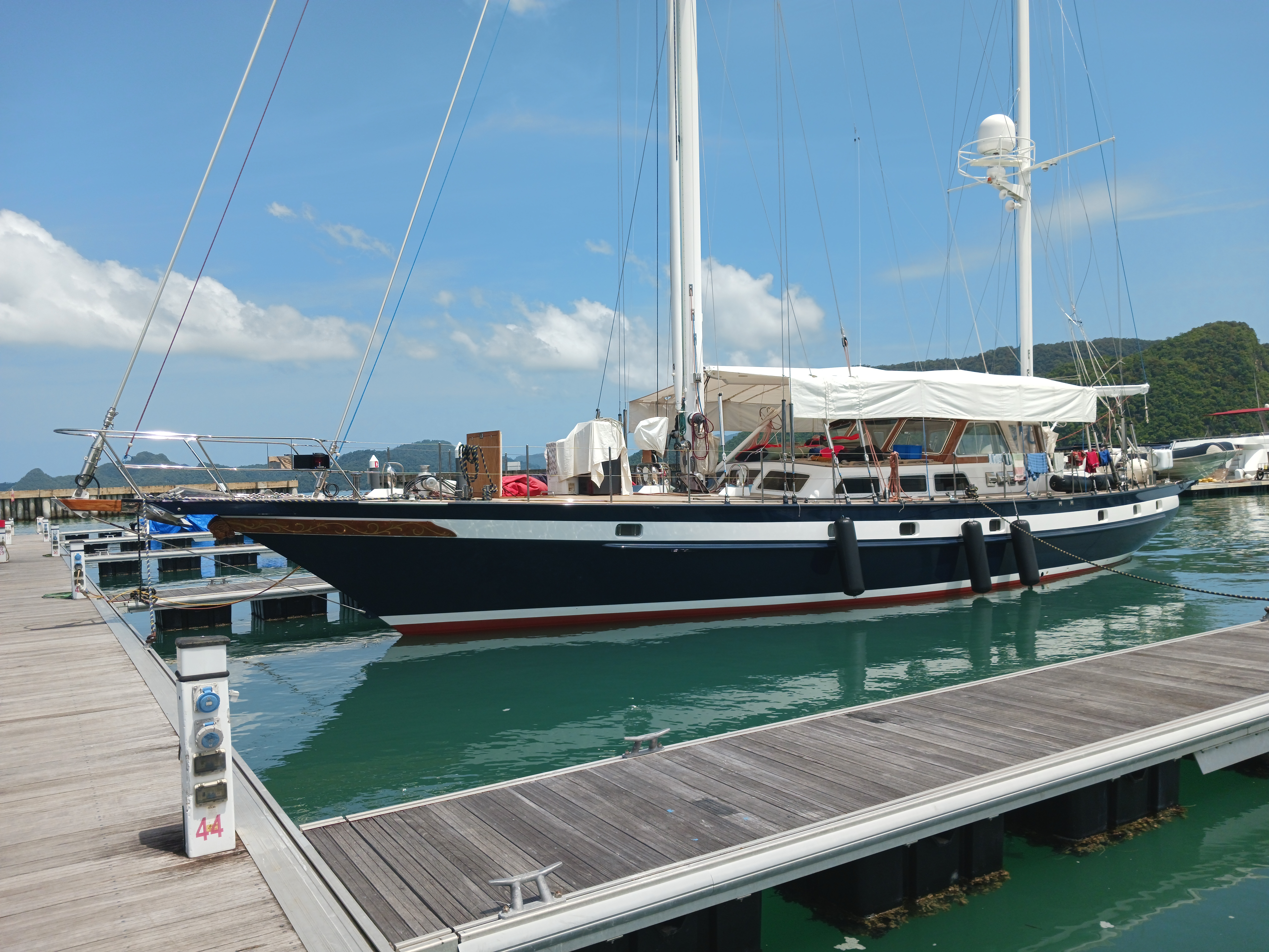 Aber nach kurzer Zeit fingen die Probleme wieder an: Batterielader, Wassermacher, Abwasserrohrverbindungen, Lichtmaschine, Navigationssystem… Wir beschlossen, nach Langkawi zurück zu segeln, um dort die nötigen Reparaturen erledigen zu können. Am letzten Ankerplatz zogen abends bedrohliche schwarze Wolken auf und nach einer extrem stürmischen Nacht riss am frühen Morgen unser Anker vom Ankerwirbel ab! Wir konnten Lapita vor dem Korallenriff bewahren und im Sturm zurück in die rettende Marina auf Langkawi segeln. Dort warteten wieder langwierige Reparaturen und der Umbau unseres Navigationssystems auf den NMEA-2000 Standard auf uns.